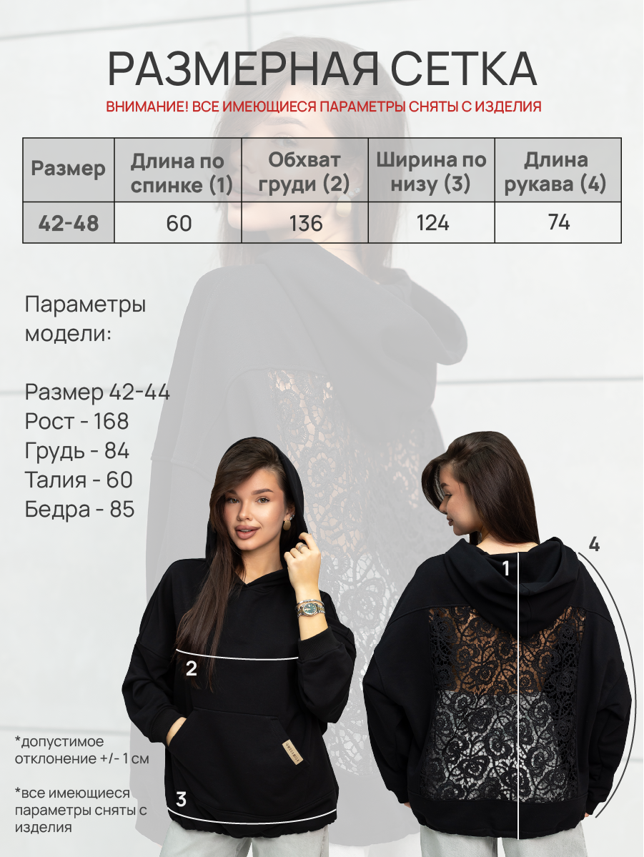 Удлиненная модель худи из мягкого хлопка с декоративной открытой спиной из ажурного кружева или сетки. Капюшон и передняя часть выполнены в классическом крое, создавая комфортную базу. Задняя часть с кружевной вставкой добавляет образу женственности и индивидуальности. Идеально сочетается с джинсами, юбками и брюками. Создайте свой уникальный образ, балансирующий между кэжуал и вечерним шиком.